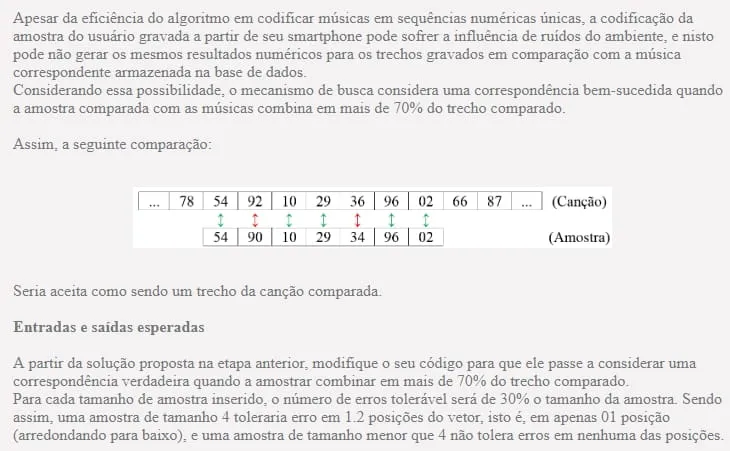 Na minha cabeça o que eu preciso fazer é testar os números, se o numero da amostra for diferente da canção a depender do tamanho da amostra eu aumentar como diz no enunciado.