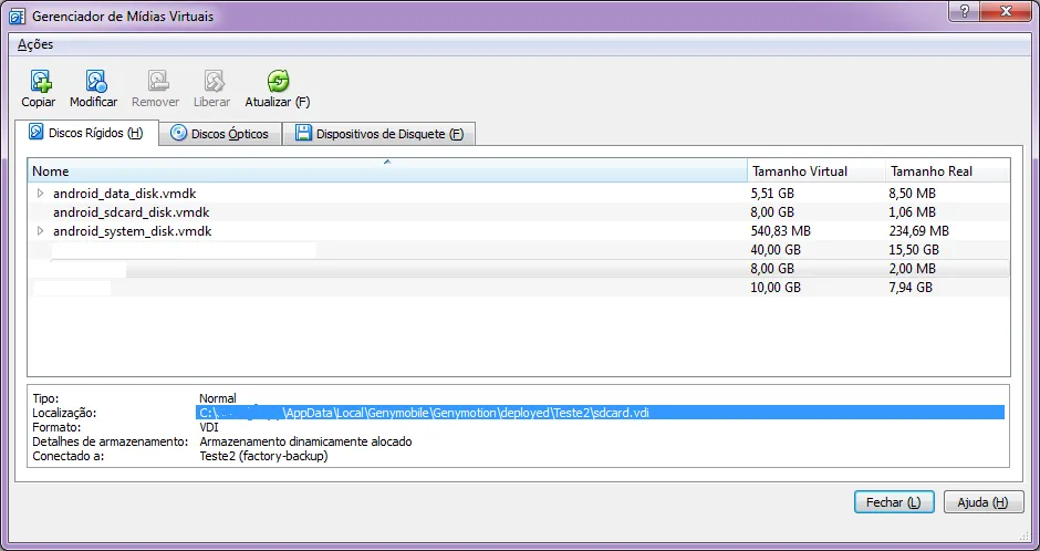 Para ver onde estão os discos do VirtualBox, vá na opção “Gerenciador de Mídias Virtuais” que fica no menu “Arquivo”. Deve abrir uma tela similar à esta: