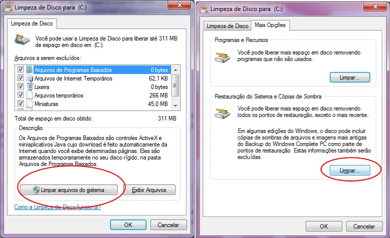 O Windows sozinho costuma gerar um bocado de lixo também. Você pode tentar fazer uma limpeza de disco nas suas partições. Volta e meia libero 10 GB sem ter instalado nada a mais, só excluindo logs de erros e cópias sombra e pontos de restauração. Dê uma olhada na aba “Mais Opções”, ou clique em “Limpar arquivos do sistema” e depois em “Mais Opções” e execute uma limpeza dos pontos de restauração: