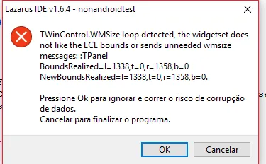Não sei se ajuda. Mas eu encontrei um projeto de exemplo para Android no meu Lazarus. Mas quando eu executo o editor fica “doidão”. As barras de rolagem começam a se mexer sozinhas e coisas do tipo. Daí aparece essa mensagem: