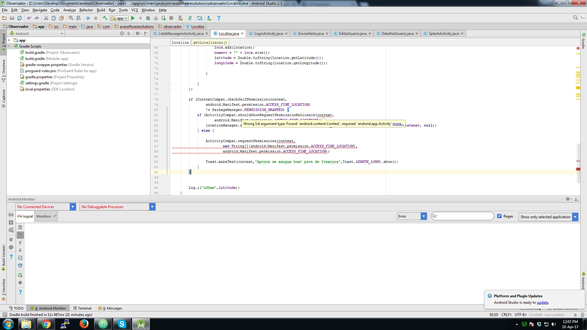 if(ContextCompat.checkSelfPermission(context,android.Manifest.permission.ACCESS_FINE_LOCATION)!=PackageManager.PERMISSION_GRANTED){if(ActivityCompat.shouldShowRequestPermissionRationale(context,android.Manifest.permission.ACCESS_FINE_LOCATION)){locationManager.requestLocationUpdates(LocationManager.GPS_PROVIDER,tempo,distancia,this.listener,null);}else{ActivityCompat.requestPermissions(context,newString[]{android.Manifest.permission.ACCESS_FINE_LOCATION},android.Manifest.permission.ACCESS_FINE_LOCATION);Toast.makeText(context,"Aprova ae sangue bom! para de frescura",Toast.LENGTH_LONG).show();}}