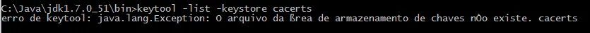 Cheguei nesse diretório, e tentei usar o comando keytool -list -keystore cacerts só que não funcionou: