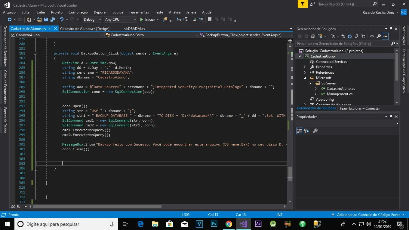stringaaa=@"Data Source="+servname+";Integrated Security=True;Initial Catalog="+dbname+"";SqlConnectionconn=newSqlConnection(aaa);conn.Open();stringstr="USE "+dbname+";";stringstr1=" BACKUP DATABASE "+dbname+"TO DISK = 'D:\\dataname\\"+dbname+"_"+dd+".Bak' WITH FORMAT, MEDIANAME = 'Z_SQLServerBackups', NAME = 'Full Backup of"+dbname+"';";SqlCommandcmd1=newSqlCommand(str,conn);SqlCommandcmd2=newSqlCommand(str1,conn);cmd1.ExecuteNonQuery();MessageBox.Show("Backup feito com Sucesso. Você pode encontrar este arquivo (DB name.Bak) no seu disco D: \\ .... nunca edite este nome de arquivo.");conn.Close();}