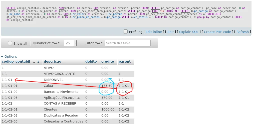 Os valores serão somados de acordo com a coluna parent tendo como referencia a coluna codigo_contabil.