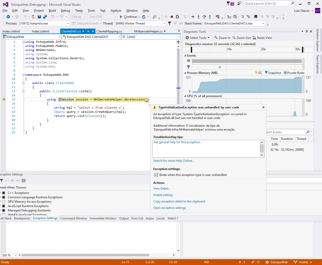 Nessa janela do exception vai em “view detail…” lá tem o stack trace, copia e cola aqui. Se tiver innerexception posta também. Quanto mais detalhes melhor será a ajuda. E copie cole o texto, print só dificulta quem está te ajudando.