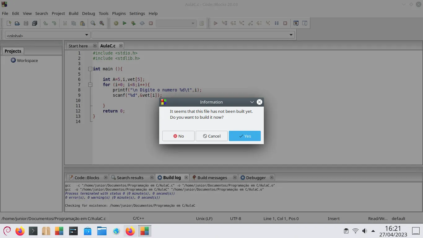 Porque quando eu tento compilar e executar no codeblocks do Linux aparece a seguinte mensagem e não compila e muito menos executa,eu clico no botão Yes,mas não vai: