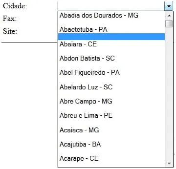 <selectname="cbCidades"><%List<Cidades>list=Util.getListCidades();Cidadescid;for(Objectobj:list){cid=(Cidades)obj;out.println("<option value "+cid.getCidCodigo()+">"+cid.getCidDescricao()+" - "+cid.getEstados().getEstUf()+"<option>");}%></select>