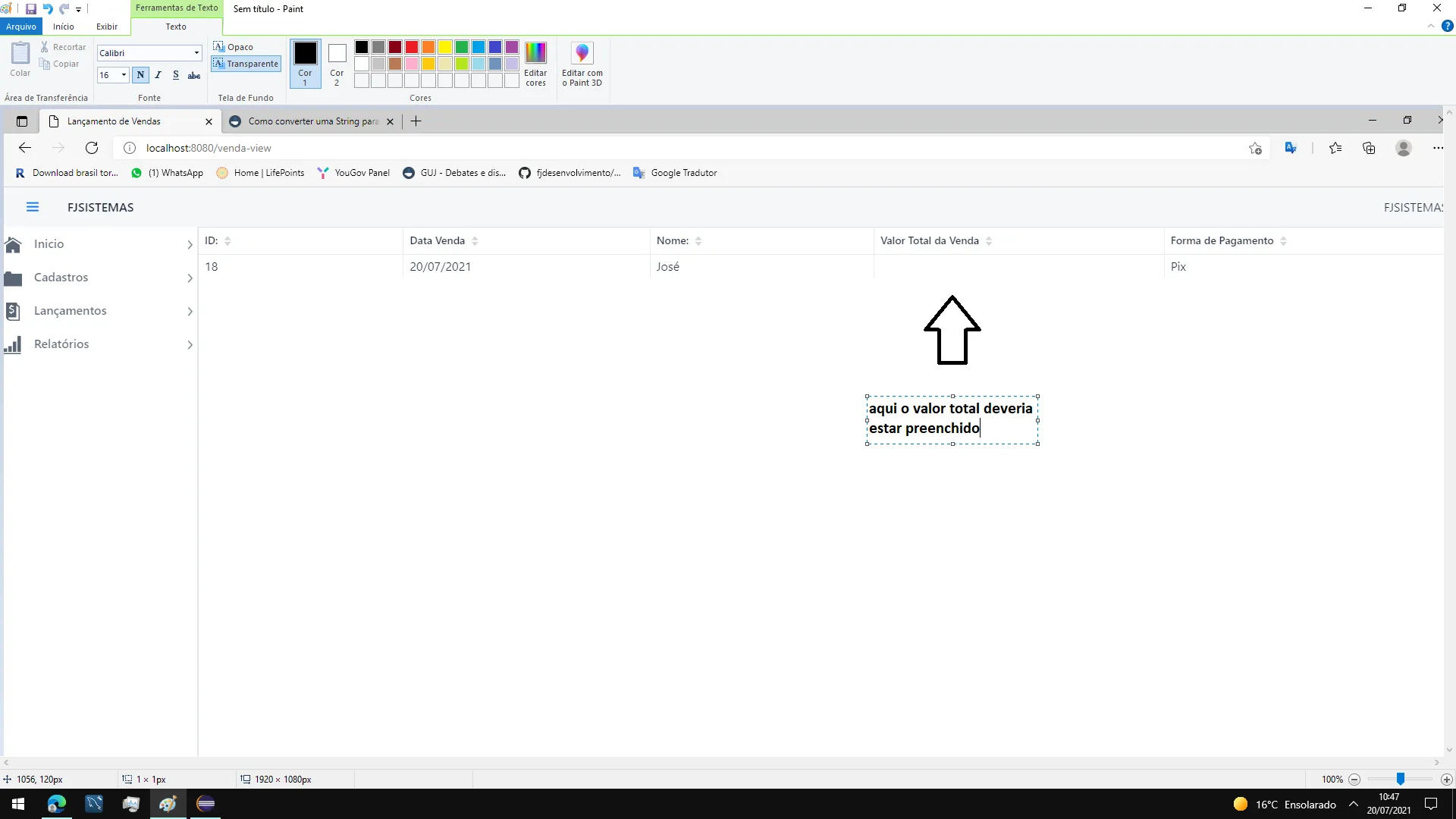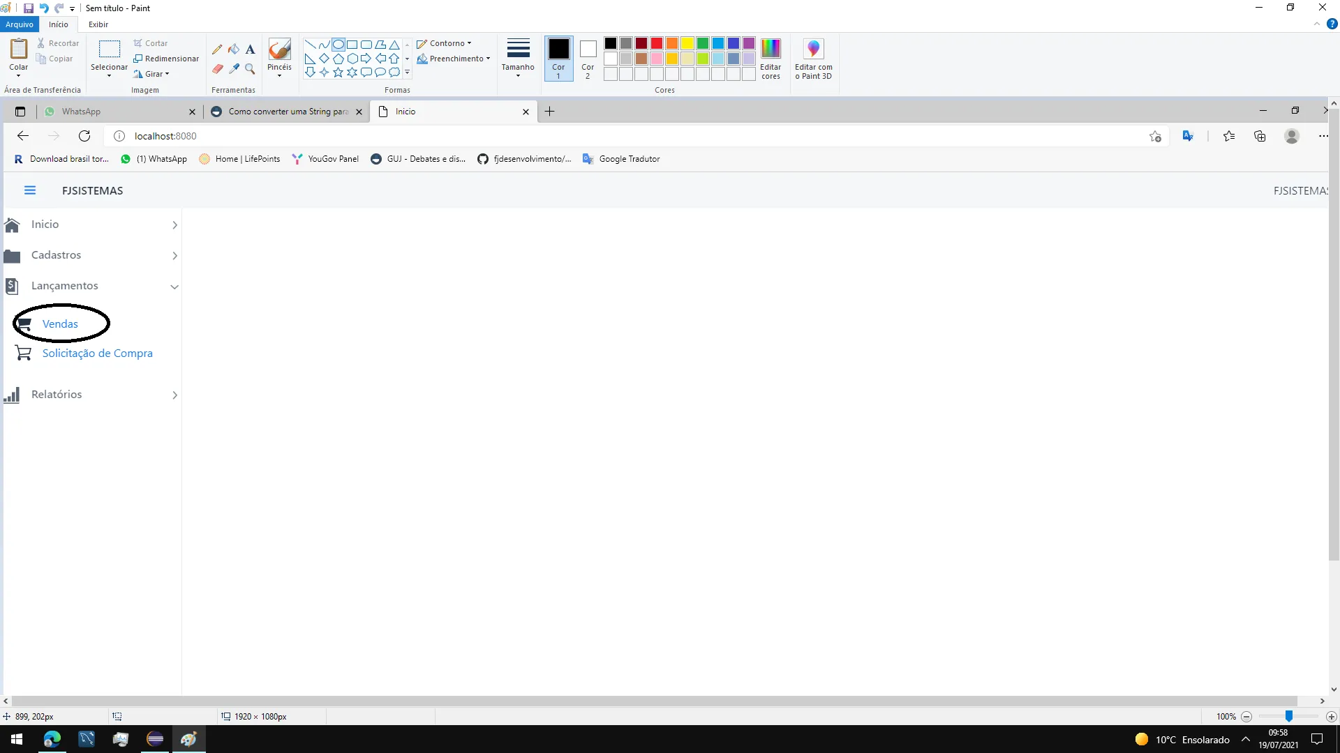 Ao rodar a aplicação toda parte de cadastro está funcionando perfeitamente, então fui para a tela de vendas, para realizar uma venda, ao clicar em Lançamentos o menu se abre com a opções de Venda e Solicitação de Compra