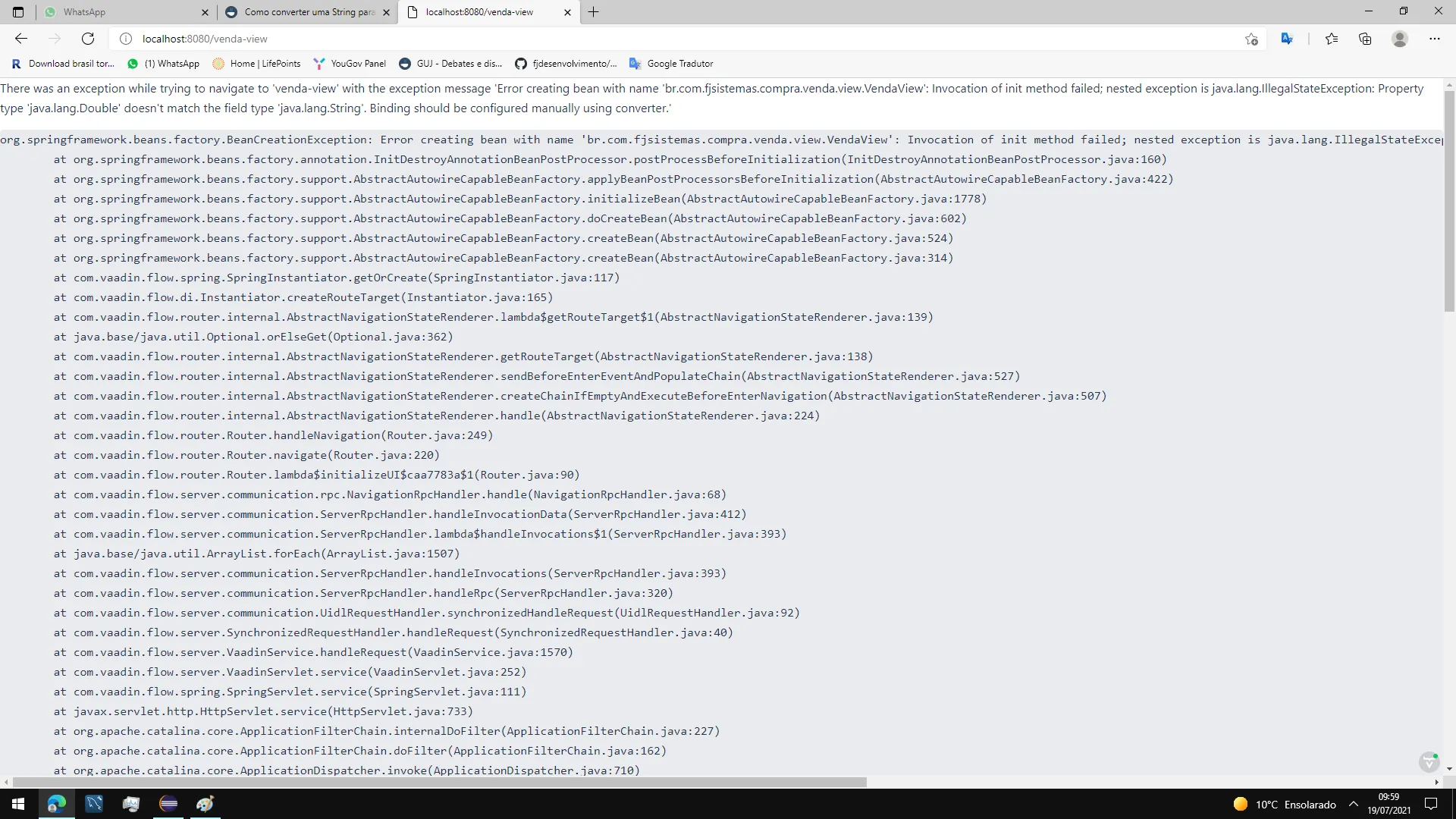 org.springframework.beans.factory.BeanCreationException: Error creating bean with name 'br.com.fjsistemas.compra.venda.view.VendaView': Invocation of init method failed; nested exception is java.lang.IllegalStateException: Property type 'java.lang.Double' doesn't match the field type 'java.lang.String'. Binding should be configured manually using converter.