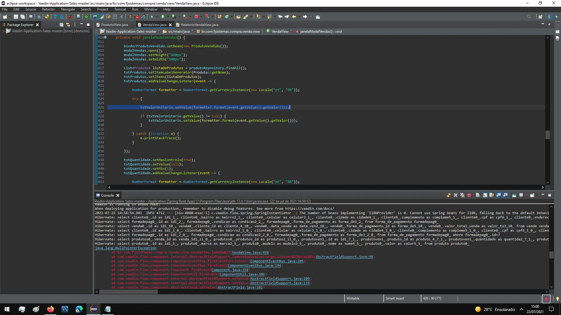 Vi que se trata de um conflito entre Double e String, tbm vi que ele chama a atenção para as linhas 159, 172 e 531 da classe VendaView