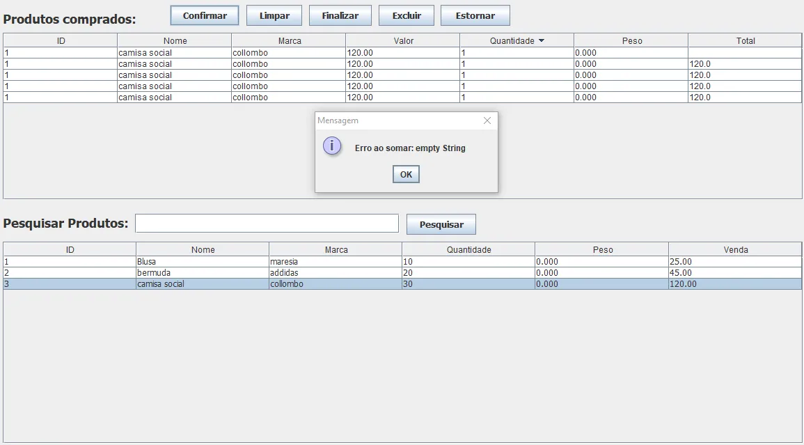 TenhoumatabelacomonomedetabelaCompra,nelatenhoumacolunatotal,queroqueessasomeosvaloresqueestãonessacolunaejogueemumajtextfieldbarraTotal.Masestoutendounsproblemas,fizumasomaparapegardoisvaloresdeduastextfildsesalvarnabarraTotal,maselenãoestásalvandonabarratotal.Outroproblemaéquenãoseicomofaçoparaelepegarosvaloresdessacolunatotal,eirsomandoemostrandonabarraTotal.Fizessemétodo:privatevoidcalculaTotal(){intsoma=0;try{for(inti=0;i<tabelaCompra.getColumnCount();i++){DoublevalorAux=(Double)tabelaCompra.getValueAt(i,6);soma+=valorAux;}Double.parseDouble(barraTotal.getText());barraTotal.setText(String.valueOf(soma));}catch(NumberFormatExceptione){JOptionPane.showMessageDialog(null,"Erro ao calcular Total Produtos: "+e.getMessage());}}