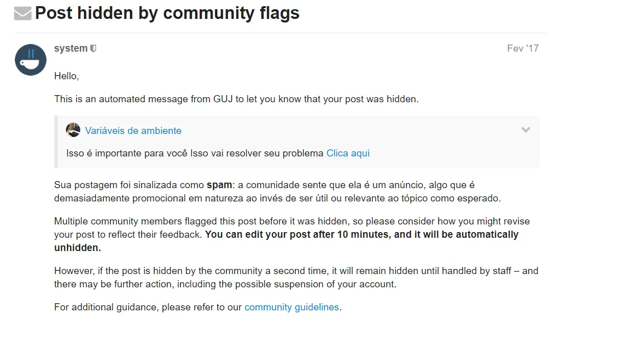 Tenho um companheiro do nosso grupo do GUJ que me solicitou uma ajuda, ele me informou que de repente a conta de usuário dele ficou impossibilitado de postar perguntas no GUJ, resolveu tentar investiga o que estava acontecendo, ao verificar a conta de usuário dele conseguiu perceber várias mensagens com o título de Post hidden by community flags como pode ver na figura abaixo;