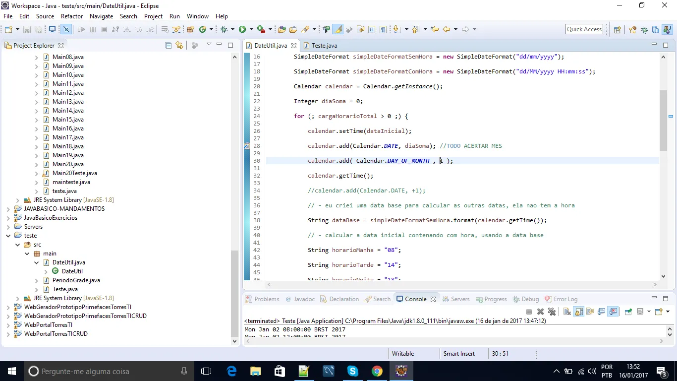 List<PeriodoGrade>listaPeriodoGrade=newArrayList<PeriodoGrade>();SimpleDateFormatsimpleDateFormatSemHora=newSimpleDateFormat("dd/mm/yyyy");SimpleDateFormatsimpleDateFormatComHora=newSimpleDateFormat("dd/MM/yyyy HH:mm:ss");Calendarcalendar=Calendar.getInstance();IntegerdiaSoma=0;for(;cargaHorarioTotal>0😉{calendar.setTime(dataInicial);calendar.add(Calendar.DATE,diaSoma);//TODO ACERTAR MEScalendar.add(Calendar.DATE,+1);// - eu criei uma data base para calcular as outras datas, ela nao tem a horaStringdataBase=simpleDateFormatSemHora.format(calendar.getTime());// - calcular a data inicial contenando com hora, usando a data baseStringhorarioManha="08";StringhorarioTarde="14";StringhorarioNoite="18";StringhorarioInicial=newString();if(periodo==1){horarioInicial=horarioManha;}elseif(periodo==2){horarioInicial=horarioTarde;}elseif(periodo==3){horarioInicial=horarioNoite;}StringdataInicialString=dataBase+" "+horarioInicial+":00:00";DatedataInicialCalculada=simpleDateFormatComHora.parse(dataInicialString);// - calcular a data final contenando com hora, usando a data baseIntegerhoraFinal=0;if(cargaHorarioTotal<cargaHorarioDia){horaFinal=Integer.parseInt(horarioInicial)+cargaHorarioTotal;}else{horaFinal=Integer.parseInt(horarioInicial)+cargaHorarioDia;}StringdataFinalString=dataBase+" "+horaFinal+":00:00";DatedataFinalCalculada=simpleDateFormatComHora.parse(dataFinalString);// - setando os valoresPeriodoGradeperiodoGrade=newPeriodoGrade();periodoGrade.setDataInicial(dataInicialCalculada);periodoGrade.setDataFinal(dataFinalCalculada);listaPeriodoGrade.add(periodoGrade);cargaHorarioTotal-=cargaHorarioDia;diaSoma++;}returnlistaPeriodoGrade;}