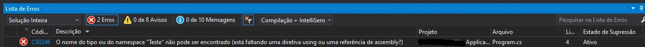 Aqui podemos ver que o problema foi adicionar a referencia ao namespace Teste.Guj (using Teste.Guj;), que não existe no projeto. Então remover esta linha solucionará o problema.