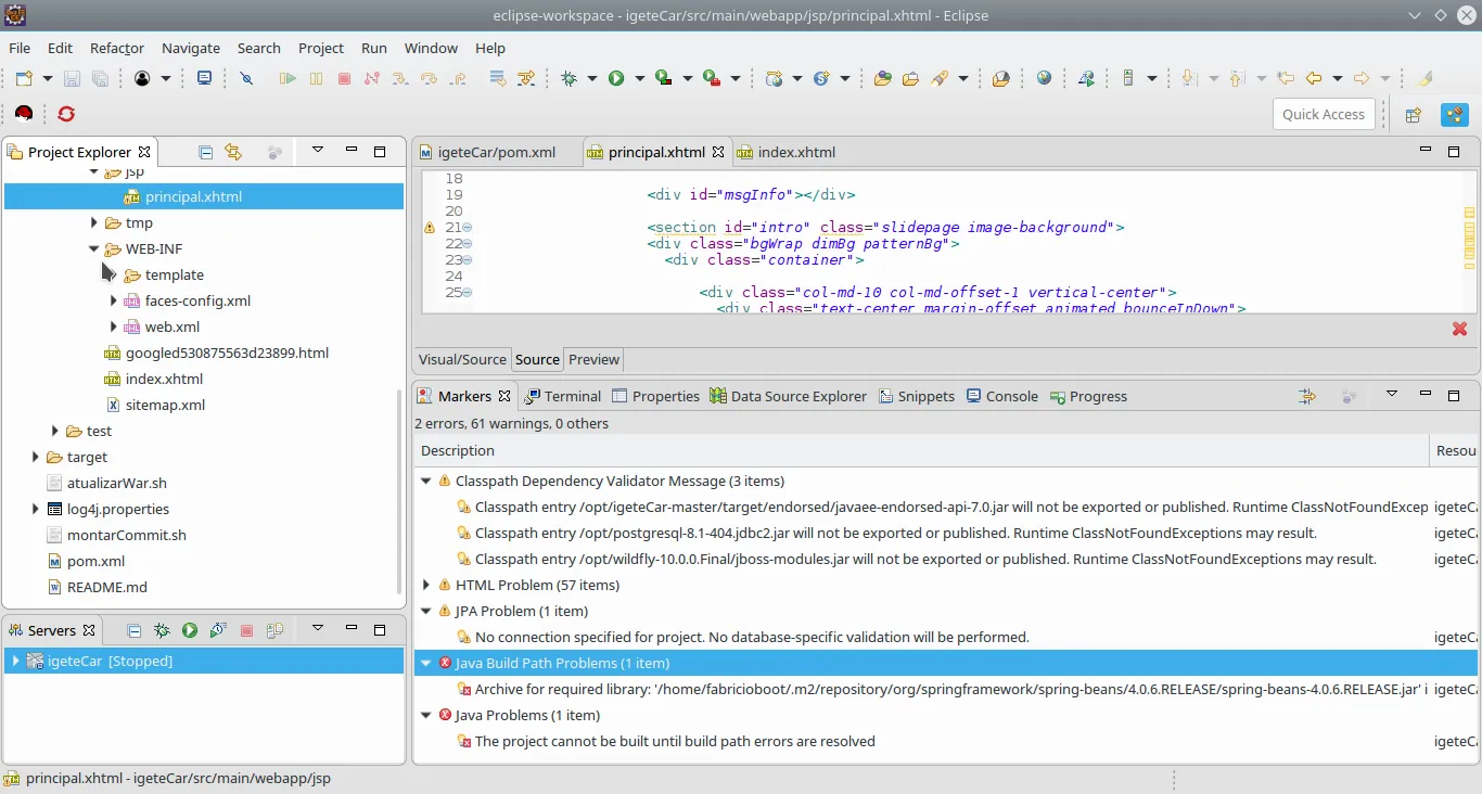 | Archive for required library: ‘/home/fabricioboot/.m2/repository/org/springframework/spring-beans/4.0.6.RELEASE/spring-beans-4.0.6.RELEASE.jar’ in project ‘igeteCar’ cannot be read or is not a valid ZIP file | igeteCar | Build path | Build Path Problem | |