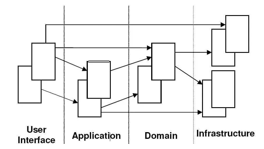Um exemplo típico de interação da aplicação, domínio e infraestrutura podiam funcionar dessa forma: O usuário deseja uma rotas de vôo, e pergunta ao serviço na camada de aplicação como fazer isso. Uma parte da aplicação busca os objetos relevantes do domínio da infraestrutura e invoca métodos relevantes para fazer isso ao verificar margens de segurança a outros vôos já registrados. Uma vez que os objetos do domínio fizeram todas as verificações e atualizaram seu status para ?decidido?, o serviço da aplicação persiste os objetos para a infraestrutura.