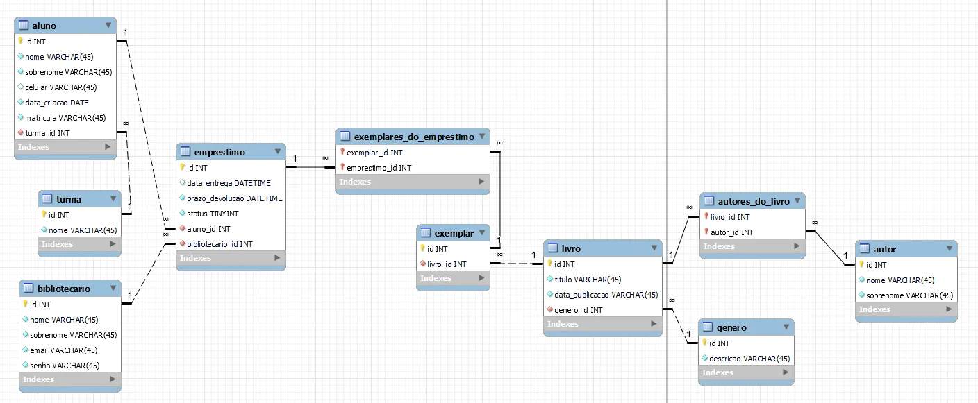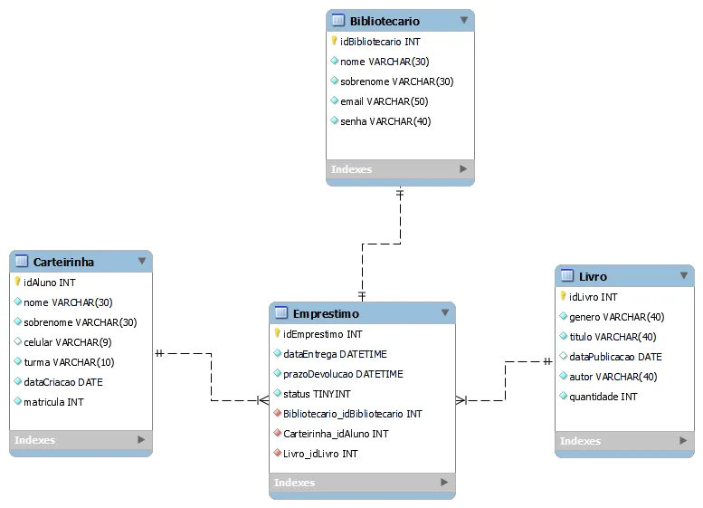 A modelagem depende dos requisitos. Olhando seu diagrama há algumas inconsistências. Vc apresenta uma tabela chamada Carteirinha, mas o primeiro atributo é o id do aluno. Sua tabela deveria chamar Aluno certo? Se o código da carteirinha do aluno é o próprio id dele e vc não precisa de mais nenhum dado para representar a carteirinha, então vc não precisa de uma tabela para as carteirinhas. Há também algumas questões de normalização para se pensar. Veja, na tabela livro você tem os atributos genero e autor. Será que não faz mais sentido você ter tabelas separadas para esses atributos? O mesmo acontece com turma em Carteirinha. Eu particularmente não gosto de colocar o nome da tabela junto ao nome dos atributos, para mim não faz sentido, então seus id deveriam se chamar apenas id não idAluno, idEmprestimo etc. Outra coisa, seus livros tem uma quantidade. Se vc precisa saber qual livro foi emprestado de fato, vc deve pensar nisso de outra forma. Vc poderia ter o livro base, com os dados dele e então uma tabela “exemplar” que se relacionaria com o livro. Outra coisa, um livro pode ter mais de um autor… Enfim, fiz uma modelagem rápida aqui me baseando no que você apresentou, mas de novo, sua modelagem depende dos requisitos. O tipo e precisão dos atributos vc precisaria ajustar. Vou mandar o arquivo do Workbench para vc tbm.