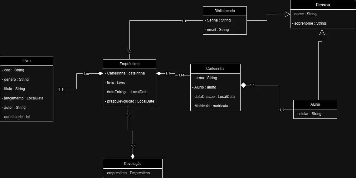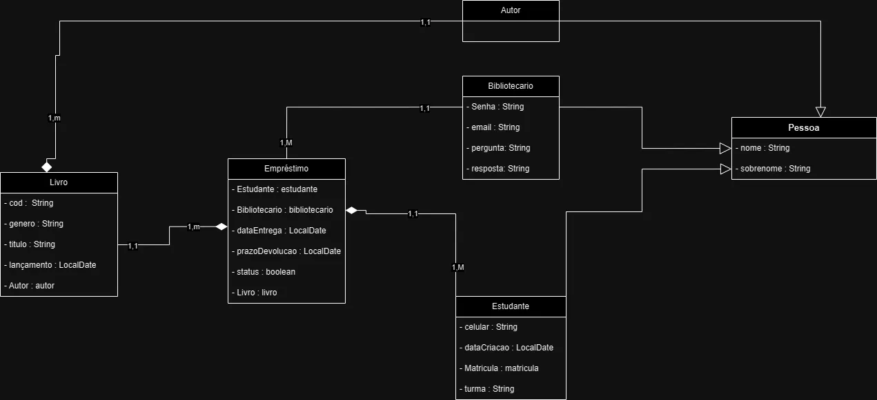 E por que bibliotecário e empréstimo tem uma relação 1:1? Um bibliotecário só pode fazer um empréstimo? Creio que 1:N faça mais sentido.