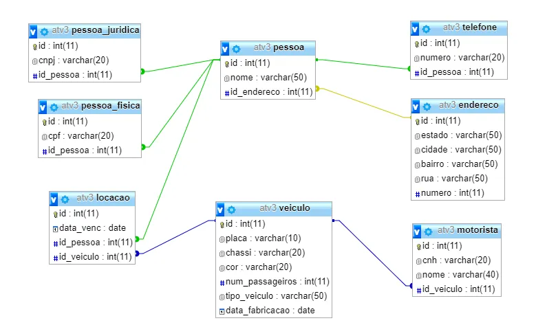 Galerinha tô com uma dúvida. Abaixo vocês podem ver como está o meu banco. A dúvida é a seguinte: como faço a consulta pra retornar: nome da pessoa jurídica, cnpj, telefone, nome do motorista, data_venc da locação, placa do veículo, tipo do veículo e cor, para todas as locações de pessoas jurídicas ordenando pelo cnpj. Eu sei que é um select com join, mas não faço ideia de por onde começar.