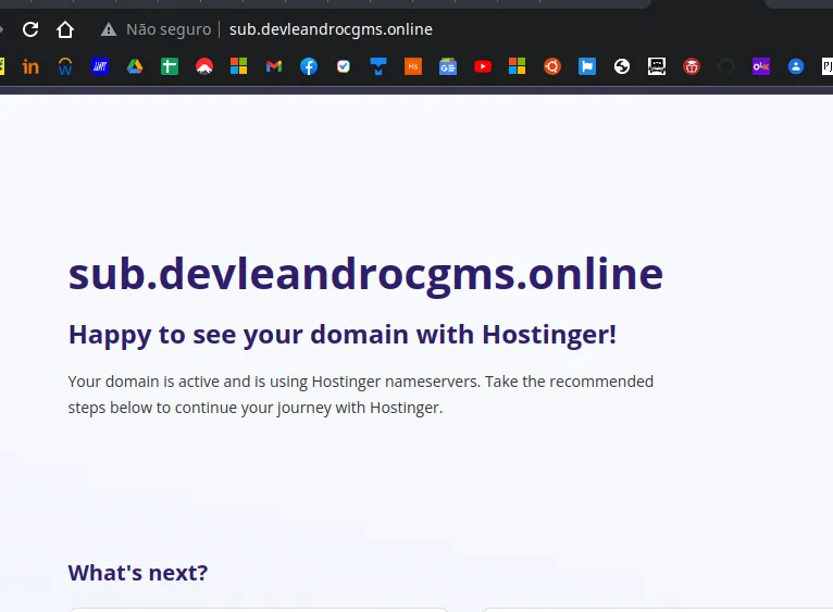 Com essas configurações na Hostinger, o único efeito é essa página da imagem abaixo e, aponto os DNS Nameserver do Google Cloud, a mensagem é de que não foi possível resolver o nome.