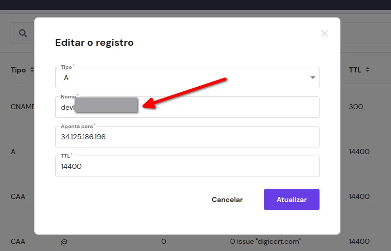 Preciso saber se esta linha de registro A está correta, se devo deixar como o nome do meu domínio no campo Nome ou deixar como “@”.