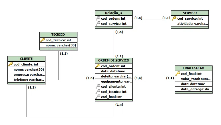 No relacionamento Finalizacao e Ordem_Servico (na imagem coloquei como Ordem de Servico, falha minha) deixei como (1:n), porém não sei se está correto. Po exemplo, depois de gerar uma OS, deverá ser possível que no sistema haja uma opção para finalizar a OS, e quando esta for finalizada, não poderá ser mais editada, etc… Desta forma, eu criei a tabela Finalizacao, que ao meu ver, deveria ter uma chave PK e FK ao mesmo tempo da tabela Ordem_Servico.