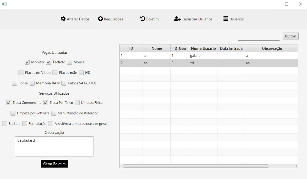 Então você seleciona os items (pode manter os checkboxes para isso), seleciona o serviço, insere observação e clica em “gerar boletim”, adicionando as informações a tabela e limpando as seleções efetuadas.