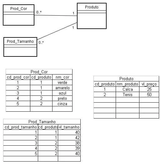 Por que criar de Produto, Produto_cor, Produto_tamanho? E se surgir algo novo cria-se uma nova tabela? Por que não deixar isso mais dinamico do tipo Produto, Caracteristica, Produto_caracteristica? Não sei se me fiz entender bem … mas a idéia é deixar possível vc criar características novas para produtos sem precisar adicionar tabelas no seu sistema.