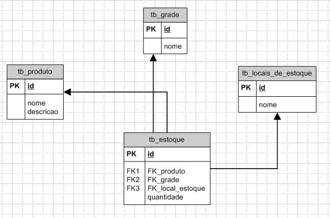 TabelaGrades(idProduto,idCor,idTamanho,quantEntrada,quantSaida)