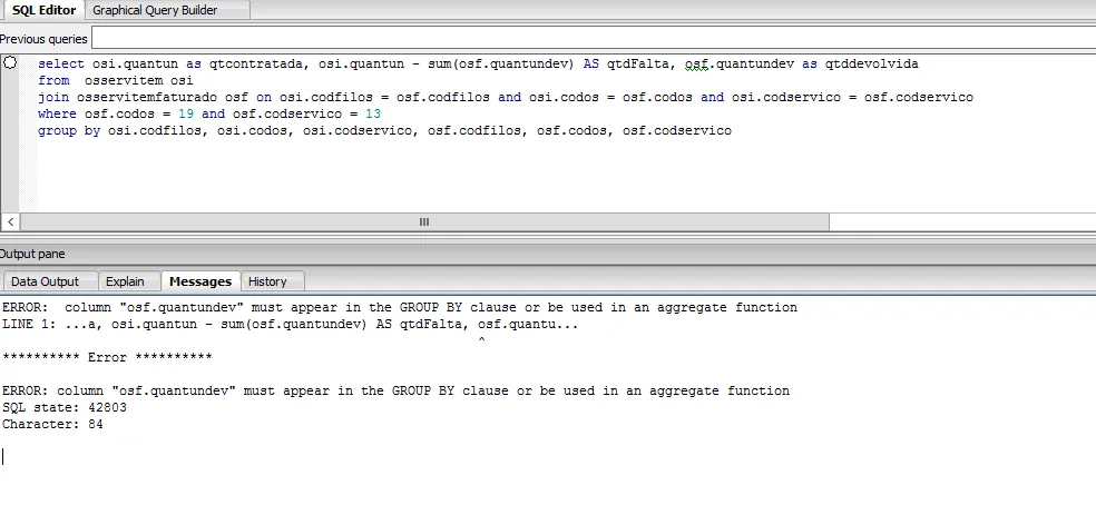 GUJ / Banco de Dados / Topico Duvida sobre como usar coluna - sum(coluna) 30 de novembro de 2020 2 respostas Flavio_Roberto_Prado 30 de novembro de 2020 Estou tentando fazer um select que faça a soma de uma coluna - outra coluna. Para isso estou usando o ‘SUM’ Alguém poderia me dar um exemplo de como fazer isso? Meus select ficou assim: image.png984×454 17.5 KB Diz que preciso usar a coluna ‘osf.quantundev’ no group by, porém o resultado que apresenta não é o esperado. Alura Análise de Dados Desenvolva hard skills técnicas e soft skills essenciais para trabalhar de forma colaborativa,... 2 Respostas pmlm 30 de nov. de 2020 Não deste nenhum contexto, torna-se dificil ajudar. Qual a cardinalidade entre osservitem e osservitemfaturado? 1-1? 1-n? E não coloques imagens, faz copy/paste direto de código, é mais simples depois de sugerir alterações. Flavio_Roberto_Prado 30 de nov. de 2020 Opa, consegui resolver. No fim precisei fazer um subselect que ficaria da seguinte forma: SELECT osi.quantun AS qtcontratada, osf.quantundev AS qtddevolvida, osi.quantun - (SELECT SUM(osff.quantundev) FROM osservitemfaturado osff WHERE osff.codos = osf codos AND osff.codservico = osf.codservico AND osff.seqfatura <= osf.seqfatura) AS qtdFaltaDevolver FROM osservitem OSI JOIN osservitemfaturado osf ON osi.codfilos = osf.codfilos AND osi.codos = osf.codos AND osi.codservico = osf.codservico WHERE osf.codos = 19 and osf.codservico = 13 ORDER BY osf.seqfatura Criado 30 de novembro de 2020 Ultima resposta 30 de nov. de 2020 Respostas 2 Participantes 2 Topicos relacionados Mascara CNPJ e CPF retorno SELECT 8 respostas Modelo Entidade-Relacionamento de Vendas 5 respostas Contar total de registros no mysql 11 respostas Como retornar apenas o primeiro registro de cada grupo de registros duplicados 9 respostas [RESOLVIDO] Soma de coluna com critério Resolvido 7 respostas Alura MER e DER: definições, banco de dados e exemplos Entenda o MER e o DER! Aprenda a modelar bancos de dados transformando objetos do mundo real em entidades, atributos e relacionamentos de forma gráfica. Casa do Codigo APIs REST: Seus servicos prontos para o mundo real Por Alexandre Saudate — Casa do Codigo