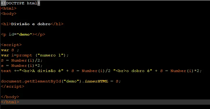 constdemo=document.getElementById('demo');//respostavarn=prompt('Digite o valor');//resgataovalorif(isNaN(n*1)){//verificaçãoseretornouumnúmerodemo.innerHTML="Valor digitado não é número";}else{lettext="A divisão é: "+(n>0?(n/2):0);text=text+" e a multiplicação é: "+(n*2);demo.innerHTML=text;}