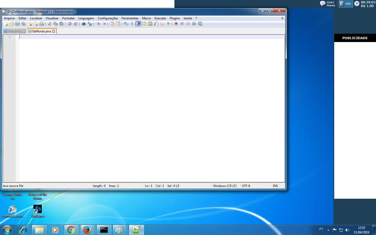 Eu criei o arquivo OlaMundo.java usando o Notepad++:
