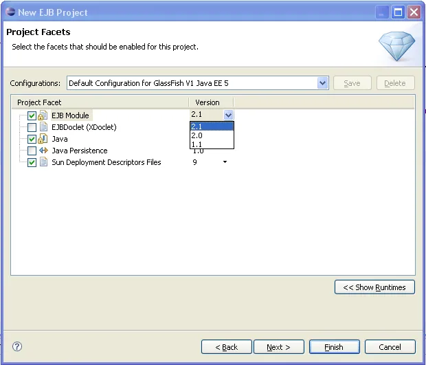 Ao criar uma aplicação corporativa usando o Glassfish como servidor de aplicações, o Eclipse não permite que se selecione nem EJB 3.0 nem JSF 1.2. Alguém teve o mesmo problema?