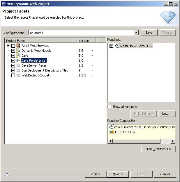 Criei um projeto novo aqui como Dinamic Web Project, defini o GlassFish como AS e na tela seguinte pude escolher JSF 1.2 e, no caso de EJB 3, a persistência com JPA