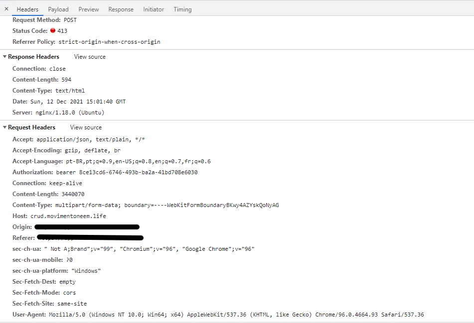 2021-12-1309:38:37[http-nio-9103-exec-1]INFO-b.c.g.g.crud.config.SmpleCORSFilter-nextHeaderName:x-forwarded-for2021-12-1309:38:37[http-nio-9103-exec-1]INFO-b.c.g.g.crud.config.SmpleCORSFilter-headerValue:191.185.125.2152021-12-1309:38:37[http-nio-9103-exec-1]INFO-b.c.g.g.crud.config.SmpleCORSFilter-nextHeaderName:host2021-12-1309:38:37[http-nio-9103-exec-1]INFO-b.c.g.g.crud.config.SmpleCORSFilter-headerValue:xxxxxx2021-12-1309:38:37[http-nio-9103-exec-1]INFO-b.c.g.g.crud.config.SmpleCORSFilter-nextHeaderName:connection2021-12-1309:38:37[http-nio-9103-exec-1]INFO-b.c.g.g.crud.config.SmpleCORSFilter-headerValue:close2021-12-1309:38:37[http-nio-9103-exec-1]INFO-b.c.g.g.crud.config.SmpleCORSFilter-nextHeaderName:content-length2021-12-1309:38:37[http-nio-9103-exec-1]INFO-b.c.g.g.crud.config.SmpleCORSFilter-headerValue:[telefoneremovido]-12-1309:38:37[http-nio-9103-exec-1]INFO-b.c.g.g.crud.config.SmpleCORSFilter-nextHeaderName:sec-ch-ua2021-12-1309:38:37[http-nio-9103-exec-1]INFO-b.c.g.g.crud.config.SmpleCORSFilter-headerValue:" Not A;Brand";v="99","Chromium";v="96","Google Chrome";v="96"2021-12-1309:38:37[http-nio-9103-exec-1]INFO-b.c.g.g.crud.config.SmpleCORSFilter-nextHeaderName:accept2021-12-1309:38:37[http-nio-9103-exec-1]INFO-b.c.g.g.crud.config.SmpleCORSFilter-headerValue:application/json,text/plain,*/*2021-12-13 09:38:37 [http-nio-9103-exec-1] INFO - b.c.g.g.crud.config.SmpleCORSFilter - nextHeaderName: content-type2021-12-13 09:38:37 [http-nio-9103-exec-1] INFO - b.c.g.g.crud.config.SmpleCORSFilter - headerValue: multipart/form-data; boundary=----WebKitFormBoundaryBG5jKKXk4qGIDqYQ2021-12-13 09:38:37 [http-nio-9103-exec-1] INFO - b.c.g.g.crud.config.SmpleCORSFilter - nextHeaderName: authorization2021-12-13 09:38:37 [http-nio-9103-exec-1] INFO - b.c.g.g.crud.config.SmpleCORSFilter - headerValue: bearer 9e02166b-5c74-45ec-83be-9b4004029f752021-12-13 09:38:37 [http-nio-9103-exec-1] INFO - b.c.g.g.crud.config.SmpleCORSFilter - nextHeaderName: sec-ch-ua-mobile2021-12-13 09:38:37 [http-nio-9103-exec-1] INFO - b.c.g.g.crud.config.SmpleCORSFilter - headerValue: ?02021-12-13 09:38:37 [http-nio-9103-exec-1] INFO - b.c.g.g.crud.config.SmpleCORSFilter - nextHeaderName: user-agent2021-12-13 09:38:37 [http-nio-9103-exec-1] INFO - b.c.g.g.crud.config.SmpleCORSFilter - headerValue: Mozilla/5.0 (Windows NT 10.0; Win64; x64) AppleWebKit/537.36 (KHTML, like Gecko) Chrome/96.0.4664.93 Safari/537.362021-12-13 09:38:37 [http-nio-9103-exec-1] INFO - b.c.g.g.crud.config.SmpleCORSFilter - nextHeaderName: sec-ch-ua-platform2021-12-13 09:38:37 [http-nio-9103-exec-1] INFO - b.c.g.g.crud.config.SmpleCORSFilter - headerValue: "Windows"2021-12-13 09:38:37 [http-nio-9103-exec-1] INFO - b.c.g.g.crud.config.SmpleCORSFilter - nextHeaderName: origin2021-12-13 09:38:37 [http-nio-9103-exec-1] INFO - b.c.g.g.crud.config.SmpleCORSFilter - headerValue: 2021-12-13 09:38:37 [http-nio-9103-exec-1] INFO - b.c.g.g.crud.config.SmpleCORSFilter - nextHeaderName: sec-fetch-site2021-12-13 09:38:37 [http-nio-9103-exec-1] INFO - b.c.g.g.crud.config.SmpleCORSFilter - headerValue: same-site2021-12-13 09:38:37 [http-nio-9103-exec-1] INFO - b.c.g.g.crud.config.SmpleCORSFilter - nextHeaderName: sec-fetch-mode2021-12-13 09:38:37 [http-nio-9103-exec-1] INFO - b.c.g.g.crud.config.SmpleCORSFilter - headerValue: cors2021-12-13 09:38:37 [http-nio-9103-exec-1] INFO - b.c.g.g.crud.config.SmpleCORSFilter - nextHeaderName: sec-fetch-dest2021-12-13 09:38:37 [http-nio-9103-exec-1] INFO - b.c.g.g.crud.config.SmpleCORSFilter - headerValue: empty2021-12-13 09:38:37 [http-nio-9103-exec-1] INFO - b.c.g.g.crud.config.SmpleCORSFilter - nextHeaderName: referer2021-12-13 09:38:37 [http-nio-9103-exec-1] INFO - b.c.g.g.crud.config.SmpleCORSFilter - headerValue: https://app.movimentoneem.life/2021-12-13 09:38:37 [http-nio-9103-exec-1] INFO - b.c.g.g.crud.config.SmpleCORSFilter - nextHeaderName: accept-encoding2021-12-13 09:38:37 [http-nio-9103-exec-1] INFO - b.c.g.g.crud.config.SmpleCORSFilter - headerValue: gzip, deflate, br2021-12-13 09:38:37 [http-nio-9103-exec-1] INFO - b.c.g.g.crud.config.SmpleCORSFilter - nextHeaderName: accept-language2021-12-13 09:38:37 [http-nio-9103-exec-1] INFO - b.c.g.g.crud.config.SmpleCORSFilter - headerValue: pt-BR,pt;q=0.9,en-US;q=0.8,en;q=0.7,fr;q=0.6