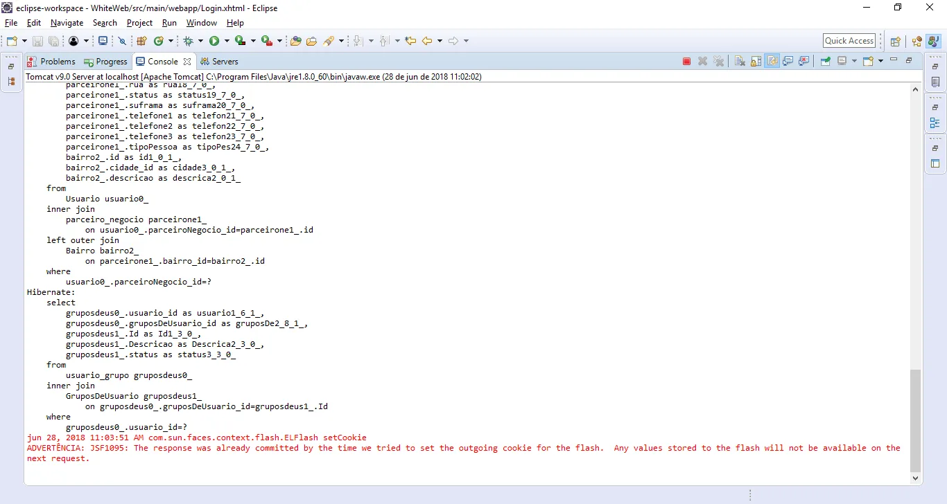 jun 26, 2018 4:31:15 PM org.apache.tomcat.util.digester.SetPropertiesRule begin ADVERTÊNCIA: [SetPropertiesRule]{Server/Service/Engine/Host/Context} Setting property ‘source’ to ‘org.eclipse.jst.jee.server:WhiteWeb’ did not find a matching property. jun 26, 2018 4:31:15 PM org.apache.catalina.startup.VersionLoggerListener log INFORMAÇÕES: Server version: Apache Tomcat/9.0.0.M26 jun 26, 2018 4:31:15 PM org.apache.catalina.startup.VersionLoggerListener log INFORMAÇÕES: Server built: Aug 2 2017 20:29:05 UTC jun 26, 2018 4:31:15 PM org.apache.catalina.startup.VersionLoggerListener log INFORMAÇÕES: Server number: 9.0.0.0 jun 26, 2018 4:31:15 PM org.apache.catalina.startup.VersionLoggerListener log INFORMAÇÕES: OS Name: Windows 10 jun 26, 2018 4:31:15 PM org.apache.catalina.startup.VersionLoggerListener log INFORMAÇÕES: OS Version: 10.0 jun 26, 2018 4:31:15 PM org.apache.catalina.startup.VersionLoggerListener log INFORMAÇÕES: Architecture: amd64 jun 26, 2018 4:31:15 PM org.apache.catalina.startup.VersionLoggerListener log INFORMAÇÕES: Java Home: C:\Program Files\Java\jre1.8.0_60 jun 26, 2018 4:31:15 PM org.apache.catalina.startup.VersionLoggerListener log INFORMAÇÕES: JVM Version: 1.8.0_60-b27 jun 26, 2018 4:31:15 PM org.apache.catalina.startup.VersionLoggerListener log INFORMAÇÕES: JVM Vendor: Oracle Corporation jun 26, 2018 4:31:15 PM org.apache.catalina.startup.VersionLoggerListener log INFORMAÇÕES: CATALINA_BASE: C:\Users\wsro.066\eclipse-workspace.metadata.plugins\org.eclipse.wst.server.core\tmp0 jun 26, 2018 4:31:15 PM org.apache.catalina.startup.VersionLoggerListener log INFORMAÇÕES: CATALINA_HOME: C:\Desenvolvimento\Apache Tomcat\apache-tomcat-9.0.0.M26 jun 26, 2018 4:31:15 PM org.apache.catalina.startup.VersionLoggerListener log INFORMAÇÕES: Command line argument: -Dcatalina.base=C:\Users\wsro.066\eclipse-workspace.metadata.plugins\org.eclipse.wst.server.core\tmp0 jun 26, 2018 4:31:15 PM org.apache.catalina.startup.VersionLoggerListener log INFORMAÇÕES: Command line argument: -Dcatalina.home=C:\Desenvolvimento\Apache Tomcat\apache-tomcat-9.0.0.M26 jun 26, 2018 4:31:15 PM org.apache.catalina.startup.VersionLoggerListener log INFORMAÇÕES: Command line argument: -Dwtp.deploy=C:\Users\wsro.066\eclipse-workspace.metadata.plugins\org.eclipse.wst.server.core\tmp0\wtpwebapps jun 26, 2018 4:31:15 PM org.apache.catalina.startup.VersionLoggerListener log INFORMAÇÕES: Command line argument: -Djava.endorsed.dirs=C:\Desenvolvimento\Apache Tomcat\apache-tomcat-9.0.0.M26\endorsed jun 26, 2018 4:31:15 PM org.apache.catalina.startup.VersionLoggerListener log INFORMAÇÕES: Command line argument: -Dfile.encoding=Cp1252 jun 26, 2018 4:31:15 PM org.apache.catalina.core.AprLifecycleListener lifecycleEvent INFORMAÇÕES: The APR based Apache Tomcat Native library which allows optimal performance in production environments was not found on the java.library.path: [C:\Program Files\Java\jre1.8.0_60\bin;C:\WINDOWS\Sun\Java\bin;C:\WINDOWS\system32;C:\WINDOWS;C:/Program Files/Java/jre1.8.0_60/bin/server;C:/Program Files/Java/jre1.8.0_60/bin;C:/Program Files/Java/jre1.8.0_60/lib/amd64;C:\ProgramData\Oracle\Java\javapath;C:\WINDOWS\system32;C:\WINDOWS;C:\WINDOWS\System32\Wbem;C:\WINDOWS\System32\WindowsPowerShell\v1.0;C:\Program Files (x86)\Skype\Phone;C:\WINDOWS\System32\OpenSSH;C:\Users\wsro.066\AppData\Local\Microsoft\WindowsApps;;C:\Desenvolvimento\IDE Eclipse\eclipse;;.] jun 26, 2018 4:31:16 PM org.apache.coyote.AbstractProtocol init INFORMAÇÕES: Initializing ProtocolHandler [“http-nio-8080”] jun 26, 2018 4:31:16 PM org.apache.tomcat.util.net.NioSelectorPool getSharedSelector INFORMAÇÕES: Using a shared selector for servlet write/read jun 26, 2018 4:31:16 PM org.apache.coyote.AbstractProtocol init INFORMAÇÕES: Initializing ProtocolHandler [“ajp-nio-8009”] jun 26, 2018 4:31:16 PM org.apache.tomcat.util.net.NioSelectorPool getSharedSelector INFORMAÇÕES: Using a shared selector for servlet write/read jun 26, 2018 4:31:16 PM org.apache.catalina.startup.Catalina load INFORMAÇÕES: Initialization processed in 2035 ms jun 26, 2018 4:31:16 PM org.apache.catalina.core.StandardService startInternal INFORMAÇÕES: Starting service [Catalina] jun 26, 2018 4:31:16 PM org.apache.catalina.core.StandardEngine startInternal INFORMAÇÕES: Starting Servlet Engine: Apache Tomcat/9.0.0.M26 jun 26, 2018 4:31:21 PM org.apache.jasper.servlet.TldScanner scanJars INFORMAÇÕES: At least one JAR was scanned for TLDs yet contained no TLDs. Enable debug logging for this logger for a complete list of JARs that were scanned but no TLDs were found in them. Skipping unneeded JARs during scanning can improve startup time and JSP compilation time. jun 26, 2018 4:31:32 PM org.apache.jasper.servlet.TldScanner scanJars INFORMAÇÕES: At least one JAR was scanned for TLDs yet contained no TLDs. Enable debug logging for this logger for a complete list of JARs that were scanned but no TLDs were found in them. Skipping unneeded JARs during scanning can improve startup time and JSP compilation time. jun 26, 2018 4:31:32 PM org.apache.catalina.core.ApplicationContext log INFORMAÇÕES: No Spring WebApplicationInitializer types detected on classpath 2018-06-26 16:31:32,928 INFO [org.jboss.weld.environment.servletWeldServlet] WELD-ENV-001008: Initialize Weld using ServletContainerInitializer 2018-06-26 16:31:32,966 INFO [org.jboss.weld.Version] WELD-000900: 2.4.7 (Final) 2018-06-26 16:31:33,270 INFO [org.jboss.weld.Bootstrap] WELD-000101: Transactional services not available. Injection of @Inject UserTransaction not available. Transactional observers will be invoked synchronously. 2018-06-26 16:31:33,636 INFO [org.jboss.weld.Bootstrap] WELD-000119: Not generating any bean definitions from modelo.ParceiroNegocio because of underlying class loading error: Type modelo.EnumTipoPessoa not found. If this is unexpected, enable DEBUG logging to see the full error. 2018-06-26 16:31:33,697 INFO [org.jboss.wel