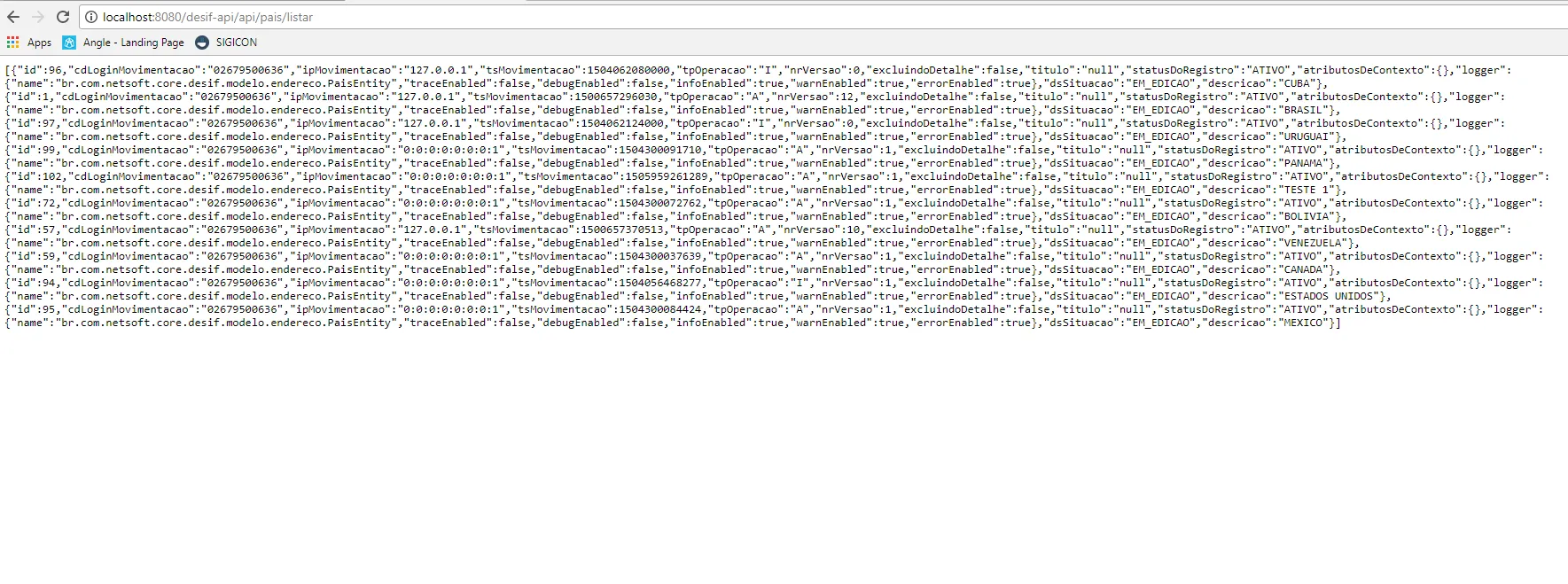 [{“id”:96,“cdLoginMovimentacao”:“[telefone removido]”,“ipMovimentacao”:“127.0.0.1”,“tsMovimentacao”:1504062080000,“tpOperacao”:“I”,“nrVersao”:0,“excluindoDetalhe”:false,“titulo”:“null”,“statusDoRegistro”:“ATIVO”,“atributosDeContexto”:{},“logger”:{“name”:“br.com.netsoft.core.desif.modelo.endereco.PaisEntity”,“traceEnabled”:false,“debugEnabled”:false,“infoEnabled”:true,“warnEnabled”:true,“errorEnabled”:true},“dsSituacao”:“EM_EDICAO”,“descricao”:“CUBA”},{“id”:1,“cdLoginMovimentacao”:“[telefone removido]”,“ipMovimentacao”:“127.0.0.1”,“tsMovimentacao”:1500657296030,“tpOperacao”:“A”,“nrVersao”:12,“excluindoDetalhe”:false,“titulo”:“null”,“statusDoRegistro”:“ATIVO”,“atributosDeContexto”:{},“logger”:{“name”:“br.com.netsoft.core.desif.modelo.endereco.PaisEntity”,“traceEnabled”:false,“debugEnabled”:false,“infoEnabled”:true,“warnEnabled”:true,“errorEnabled”:true},“dsSituacao”:“EM_EDICAO”,“descricao”:“BRASIL”},{“id”:97,“cdLoginMovimentacao”:“[telefone removido]”,“ipMovimentacao”:“127.0.0.1”,“tsMovimentacao”:1504062124000,“tpOperacao”:“I”,“nrVersao”:0,“excluindoDetalhe”:false,“titulo”:“null”,“statusDoRegistro”:“ATIVO”,“atributosDeContexto”:{},“logger”:{“name”:“br.com.netsoft.core.desif.modelo.endereco.PaisEntity”,“traceEnabled”:false,“debugEnabled”:false,“infoEnabled”:true,“warnEnabled”:true,“errorEnabled”:true},“dsSituacao”:“EM_EDICAO”,“descricao”:“URUGUAI”},{“id”:99,“cdLoginMovimentacao”:“[telefone removido]”,“ipMovimentacao”:“0:0:0:0:0:0:0:1”,“tsMovimentacao”:1504300091710,“tpOperacao”:“A”,“nrVersao”:1,“excluindoDetalhe”:false,“titulo”:“null”,“statusDoRegistro”:“ATIVO”,“atributosDeContexto”:{},“logger”:{“name”:“br.com.netsoft.core.desif.modelo.endereco.PaisEntity”,“traceEnabled”:false,“debugEnabled”:false,“infoEnabled”:true,“warnEnabled”:true,“errorEnabled”:true},“dsSituacao”:“EM_EDICAO”,“descricao”:“PANAMA”},{“id”:102,“cdLoginMovimentacao”:“[telefone removido]”,“ipMovimentacao”:“0:0:0:0:0:0:0:1”,“tsMovimentacao”:1505959261289,“tpOperacao”:“A”,“nrVersao”:1,“excluindoDetalhe”:false,“titulo”:“null”,“statusDoRegistro”:“ATIVO”,“atributosDeContexto”:{},“logger”:{“name”:“br.com.netsoft.core.desif.modelo.endereco.PaisEntity”,“traceEnabled”:false,“debugEnabled”:false,“infoEnabled”:true,“warnEnabled”:true,“errorEnabled”:true},“dsSituacao”:“EM_EDICAO”,“descricao”:“TESTE 1”},{“id”:72,“cdLoginMovimentacao”:“[telefone removido]”,“ipMovimentacao”:“0:0:0:0:0:0:0:1”,“tsMovimentacao”:1504300072762,“tpOperacao”:“A”,“nrVersao”:1,“excluindoDetalhe”:false,“titulo”:“null”,“statusDoRegistro”:“ATIVO”,“atributosDeContexto”:{},“logger”:{“name”:“br.com.netsoft.core.desif.modelo.endereco.PaisEntity”,“traceEnabled”:false,“debugEnabled”:false,“infoEnabled”:true,“warnEnabled”:true,“errorEnabled”:true},“dsSituacao”:“EM_EDICAO”,“descricao”:“BOLIVIA”},{“id”:57,“cdLoginMovimentacao”:“[telefone removido]”,“ipMovimentacao”:“127.0.0.1”,“tsMovimentacao”:1500657370513,“tpOperacao”:“A”,“nrVersao”:10,“excluindoDetalhe”:false,“titulo”:“null”,“statusDoRegistro”:“ATIVO”,“atributosDeContexto”:{},“logger”:{“name”:“br.com.netsoft.core.desif.modelo.endereco.PaisEntity”,“traceEnabled”:false,“debugEnabled”:false,“infoEnabled”:true,“warnEnabled”:true,“errorEnabled”:true},“dsSituacao”:“EM_EDICAO”,“descricao”:“VENEZUELA”},{“id”:59,“cdLoginMovimentacao”:“[telefone removido]”,“ipMovimentacao”:“0:0:0:0:0:0:0:1”,“tsMovimentacao”:1504300037639,“tpOperacao”:“A”,“nrVersao”:1,“excluindoDetalhe”:false,“titulo”:“null”,“statusDoRegistro”:“ATIVO”,“atributosDeContexto”:{},“logger”:{“name”:“br.com.netsoft.core.desif.modelo.endereco.PaisEntity”,“traceEnabled”:false,“debugEnabled”:false,“infoEnabled”:true,“warnEnabled”:true,“errorEnabled”:true},“dsSituacao”:“EM_EDICAO”,“descricao”:“CANADA”},{“id”:94,“cdLoginMovimentacao”:“[telefone removido]”,“ipMovimentacao”:“0:0:0:0:0:0:0:1”,“tsMovimentacao”:1504056468277,“tpOperacao”:“I”,“nrVersao”:1,“excluindoDetalhe”:false,“titulo”:“null”,“statusDoRegistro”:“ATIVO”,“atributosDeContexto”:{},“logger”:{“name”:“br.com.netsoft.core.desif.modelo.endereco.PaisEntity”,“traceEnabled”:false,“debugEnabled”:false,“infoEnabled”:true,“warnEnabled”:true,“errorEnabled”:true},“dsSituacao”:“EM_EDICAO”,“descricao”:“ESTADOS UNIDOS”},{“id”:95,“cdLoginMovimentacao”:“[telefone removido]”,“ipMovimentacao”:“0:0:0:0:0:0:0:1”,“tsMovimentacao”:1504300084424,“tpOperacao”:“A”,“nrVersao”:1,“excluindoDetalhe”:false,“titulo”:“null”,“statusDoRegistro”:“ATIVO”,“atributosDeContexto”:{},“logger”:{“name”:“br.com.netsoft.core.desif.modelo.endereco.PaisEntity”,“traceEnabled”:false,“debugEnabled”:false,“infoEnabled”:true,“warnEnabled”:true,“errorEnabled”:true},“dsSituacao”:“EM_EDICAO”,“descricao”:“MEXICO”}]