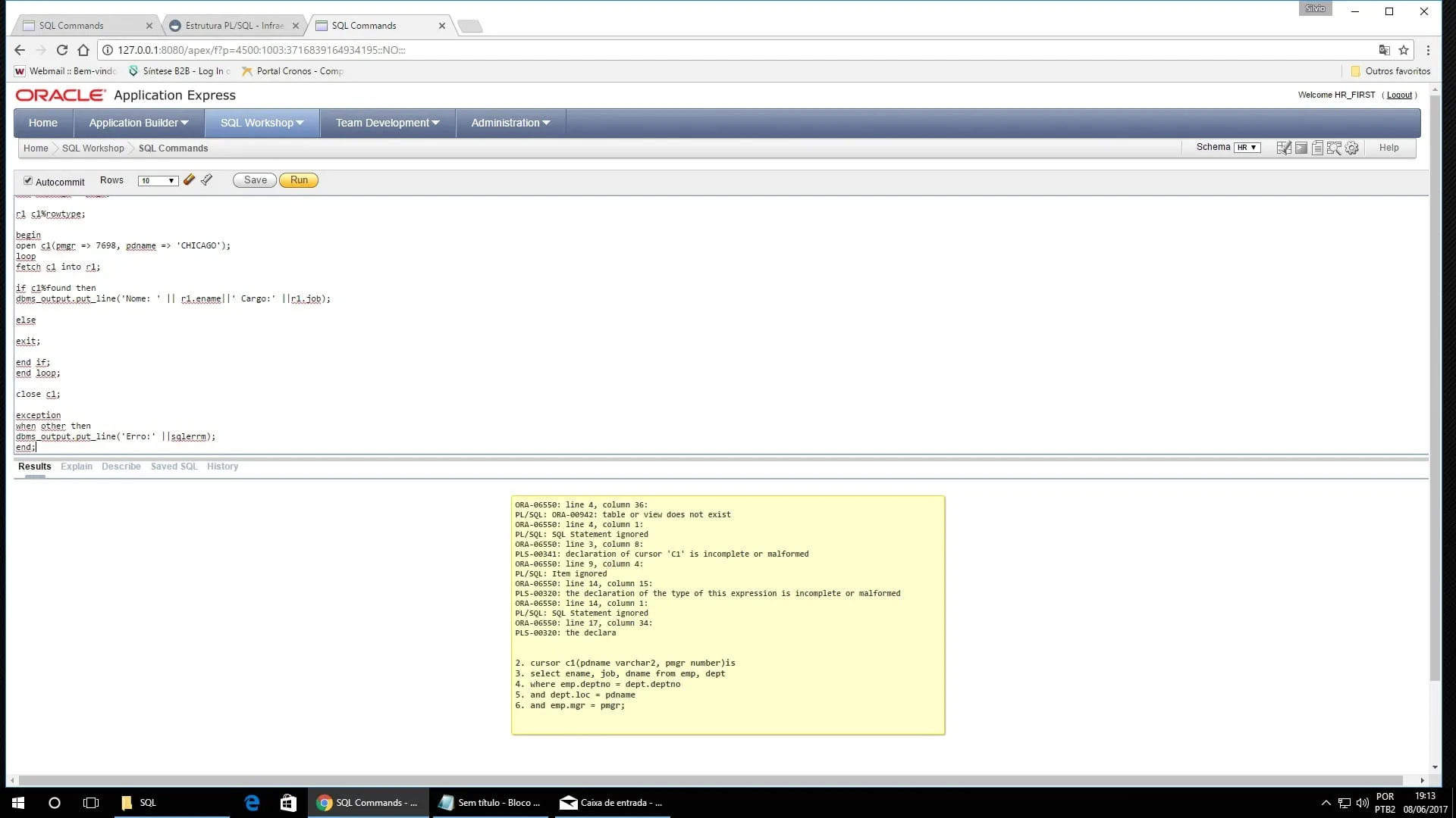 Olá estou começando a estudar banco de dados e estou usando o livro PLSQL da casa do código porém o código inicial não roda alguém pode me ajudar?