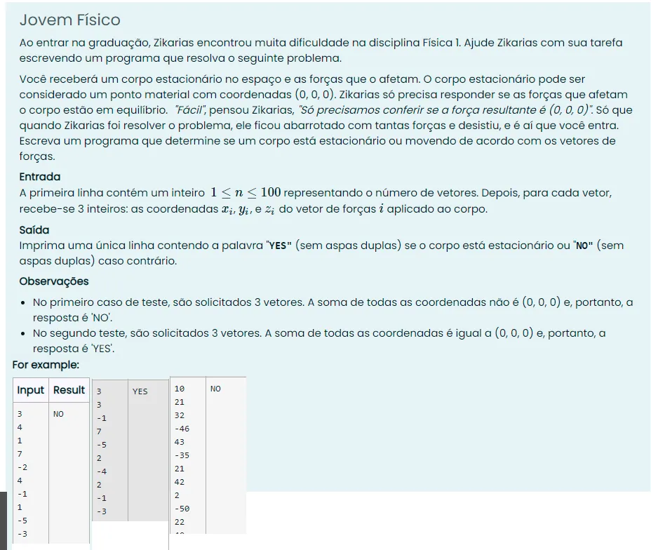 Nesse exercício você tem que somar todas as componentes x,y e z de cada vetor e ver se todas dão zero. Então, essa aqui é uma solução possível.