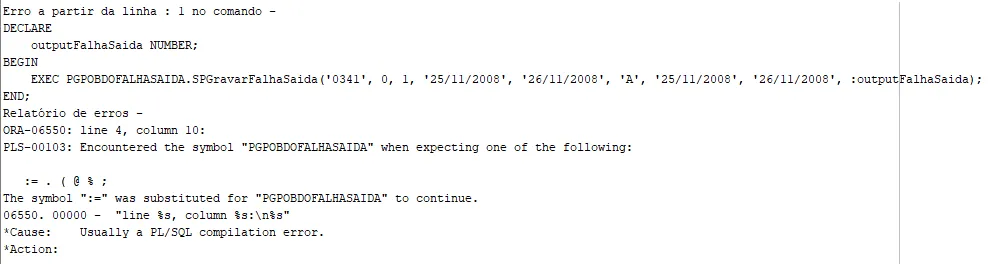 EXEC PGPOBDOFALHASAIDA.SPGravarFalhaSaida(0341, 0, 1, 25/11/2008, 26/11/2008, A, 25/11/2008, 26/11/2008, :outputFalhaSaida);