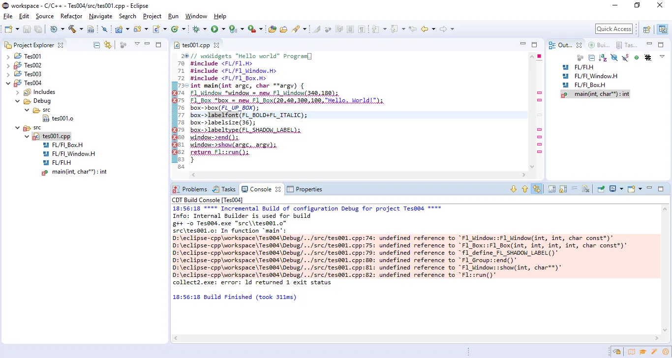 Alguém já teve essa experiência em utilizar o compilador GCC do MinGW e FLTK para criar Interface Gráfica. Segue erro: