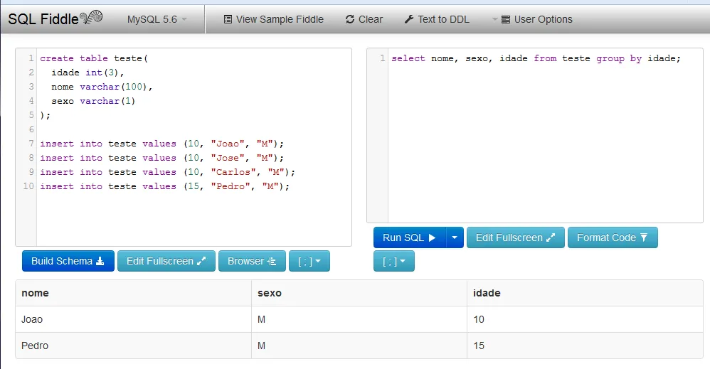 Quero o mesmo resultado no firebird que é possível no Mysql usando: select nome, sexo, idade from teste group by idade;