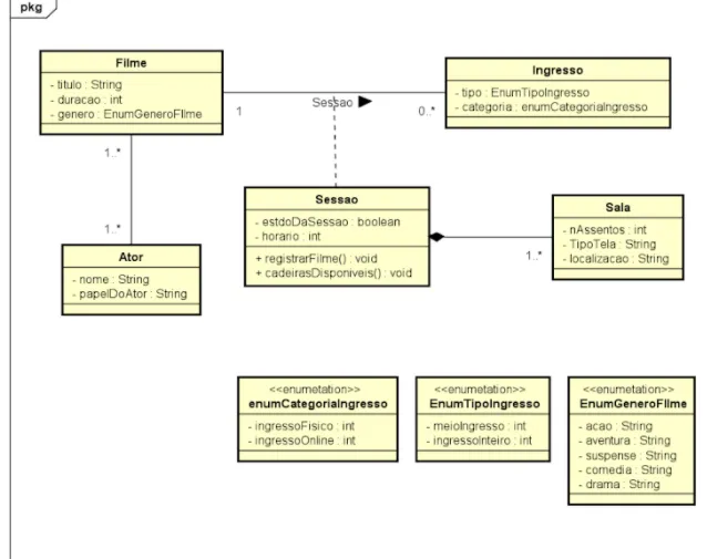 Enfim @ariadny… Com o @staroski disse, esse diagrama está bem estranho… Não concordo tbm com o relacionamento entre Sessao e Sala. Duvido que seu professor vá corrigir e peitar ele, provavelmente, não vai dar certo a não ser que você entenda mais que ele. Faça o que está sendo pedido. Cada Sessão terá uma referência a um Filme e uma referência a um Ingresso. Do ponto de vista de implementação, esse relacionamento N:M entre Ator e Filme também pode ser um problema… Enfim, seria algo assim (simplificado).