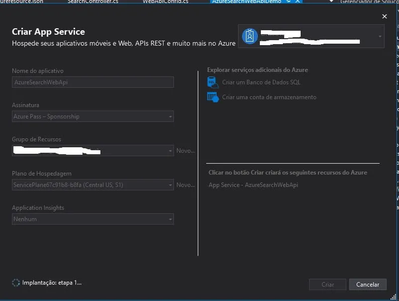 Estou tentando implantar um WebApi na Azure, mas o Visual Studio não gera saída, fica somente nesta tela.