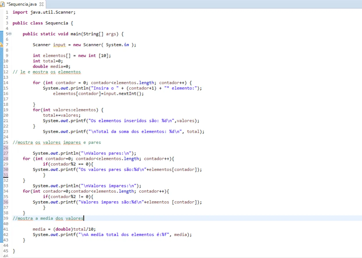 Desenvolver um programa na linguagem Java, utilizando array para receber recebe uma sequência de 10 números inteiros a serem informados pelo usuário, e em seguida mostre na tela: