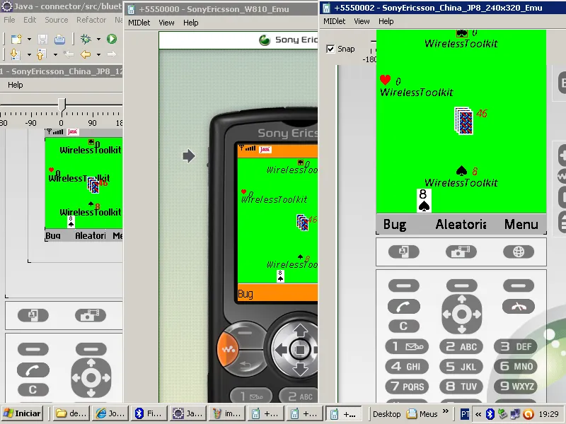Crie dois jogos multiplayers para dispositivos que suportam Bluetooth. Um jogo é de cartas e o outro é o classico do pong, ou seja, um tijolo que tem que acertar a bola. A diferença porem é que nesse caso pode-se jogar até 4 jogadores e para qualquer formato de celular. Até o momento testei no Nokia 5000,6610,2630,5800, se alguém puder testar irei agradescer bastante. Caso alguém precisar dos fontes, sem problemas, posso mandar!!:lol: