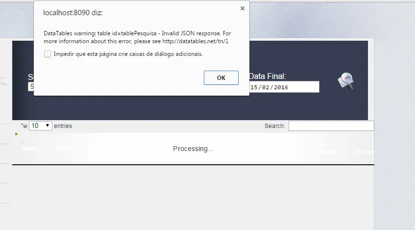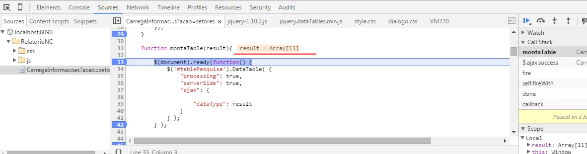 estou tendado montar um table utilizando jquery. só que exibi um erro no navegador e não consigo solucionar, já me passou pela cabeça que o erro possa está no Jquery mais já troquei e continua na msm foi add as imagens com os erros.