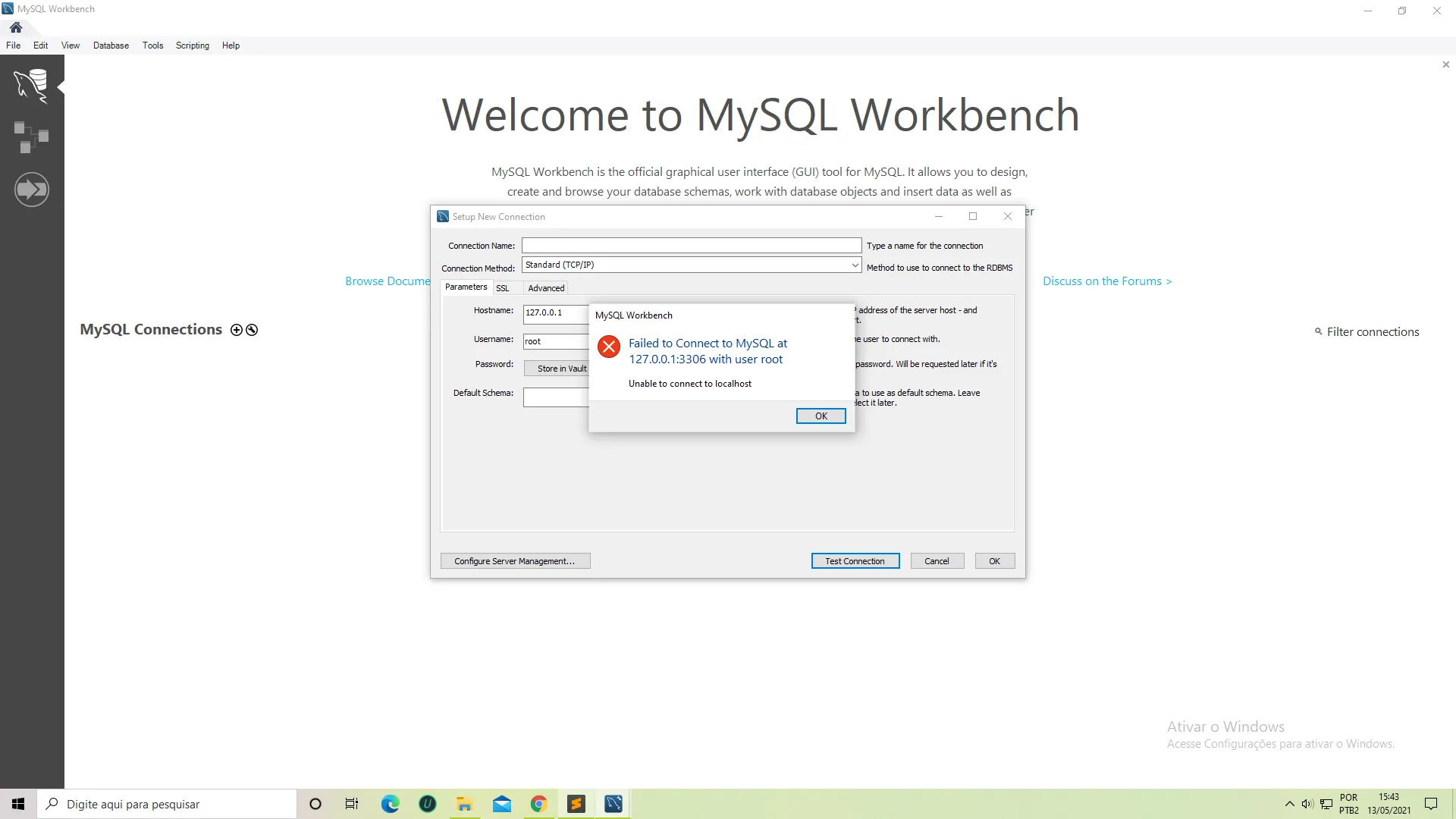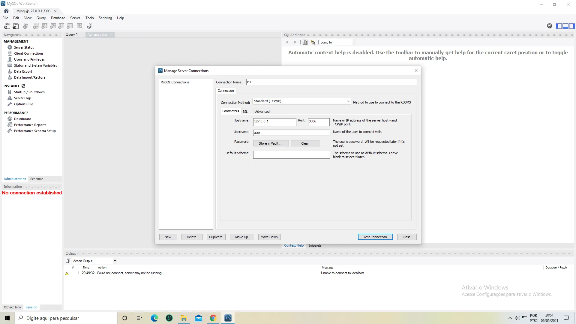Não tem problema. A pergunta é, o MySQL está instalado? Normalmente o usuário que vem por padrão na instalação é o usuário “root” não “user” igual está na caixa de texto Username. Experimente colocar root ali. A senha normalmente é vazia ou root de novo.
