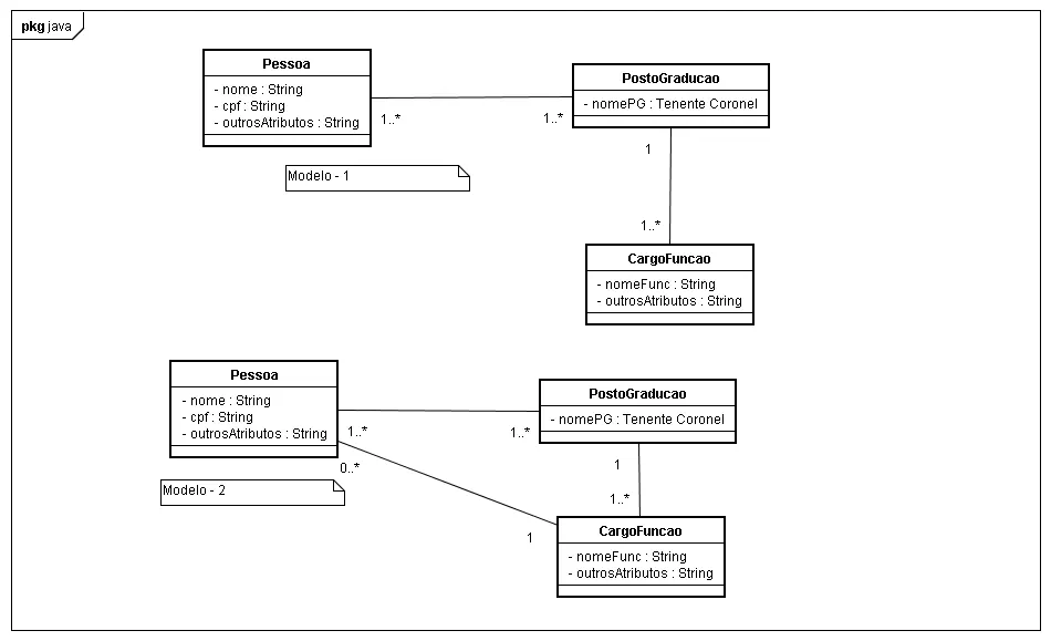 Gostaria a quem puder me dar uma opiniáo sobre o diagrama de classes que posto aqui. O cenário é o seguinte. “Eu tenho uma Pessoa que poderá ocupar um Posto/Graduacao ao long ode carreira. Da um Posto/Graducao poderá ter uma mais de uma Funcao vinculada a ele. Até aí tudo bem, mas o detelhe é que Uma Pessoa precisa estar vinculada a uma Funcao tbm”. Como exposto nos diagrama abaixo. O que eu acho esquisito é a ligação entre as classes Pessoa->PostoGraducao->Funcao->Pessoa fechando o clico. No modelo um nao considero a pessoa vinculada a Funcao, porém eu nao terei como pegar uma Funcao vinculada a uma pessoa. Gostaria de um opinião sobre a minha modelagem. Qual a mais adequada?