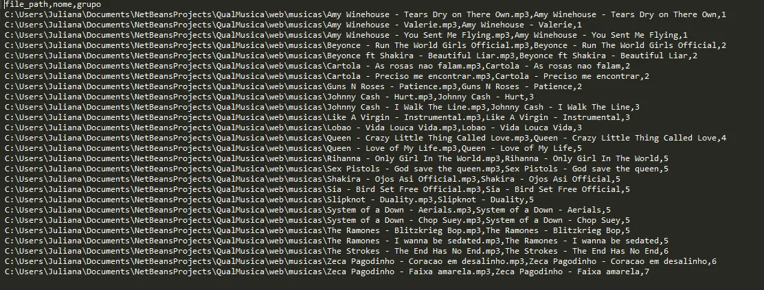 INFILE 'C:\\Users\\Juliana\\Desktop\\appMusicas.csv'